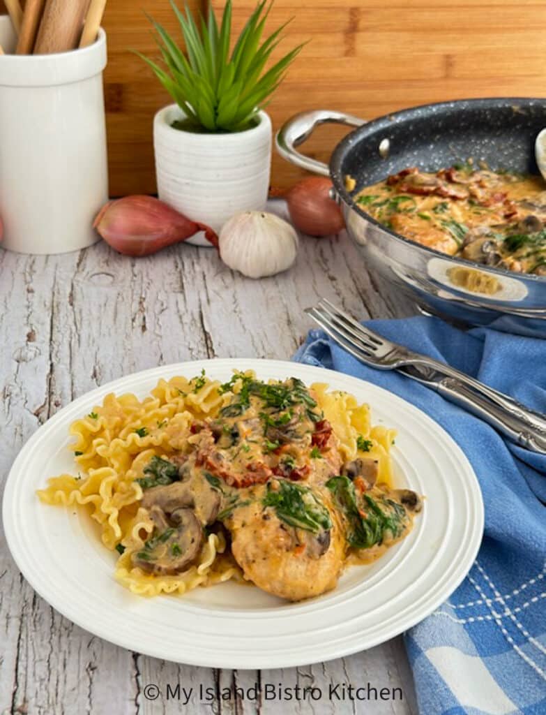 This Creamy Tuscan Chicken dish, in my opinion, certainly qualifies as a restaurant-quality entrée that can be made in one pan right in your own kitchen. The dish consists of boneless skinless chicken breasts combined with mushrooms, sun-dried tomatoes, and nutrient-rich spinach in a delectable creamy sauce. It’s packed with lovely flavor and is wonderful served with pasta, rice, or potato of choice.